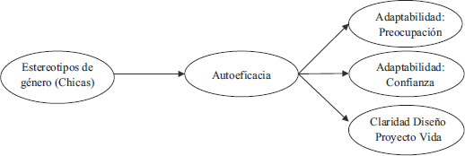 Sobre la base de la bibliografía revisada, planteamos la hipótesis de que existen relaciones estadísticamente significativas entre los estereotipos de género de las adolescentes, la autoeficacia en la toma de decisiones profesionales, la adaptabilidad de la carrera y la claridad en el diseño del proyecto de vida. También hipotetizamos que los estereotipos de género de las adolescentes predicen la autoeficacia en la toma de decisiones profesionales, y ésta, a su vez, predice la adaptabilidad de la carrera y la claridad del diseño del proyecto de vida (ver Figura I).