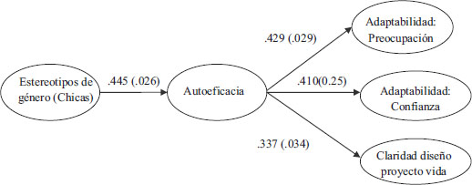 Gender stereotypes are at the root of gender inequalities in education and employment. These stereotypes affect adolescent girls' academic performance, interests, behaviours and career choices. The aims of the study are: a) to examine whether there are differences in career decision self-efficacy, career adaptability and clarity of life design of adolescent girls according to their gender stereotypes; b) to introduce a model with the independent variable “gender stereotype” to understand the relationship between the analyzed variables. The study involved 1,012 female students in the 3rd and 4th years of secondary education. Data collection was carried out using the Academic and Vocational Guidance Questionnaire. Correlation analyses and parametric tests were carried out; a structural equation model was run to understand the relationships between variables and to test a hypothetical model predicting the effect of gender stereotypes. Results showed that girls with high gender stereotypes have lower scores on career decision-making self-efficacy, career adaptability and clarity of life design than girls with low stereotypes. A parsimonious model was constructed to fit the data, in which adolescent girls' stereotypes predicted career decision-making self-efficacy, and in turn self-efficacy predicted career adaptability and clarity of life design. The improvement of these vocational variables in adolescent female students requires a critical analysis of the beliefs that underlie gender stereotypes; an analysis that allows them to become aware of the socio-cultural nature of these stereotypes, promote their deconstruction and empower them vocationally.