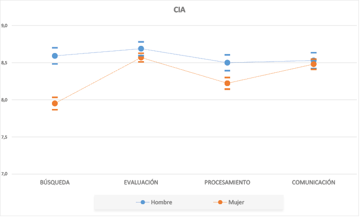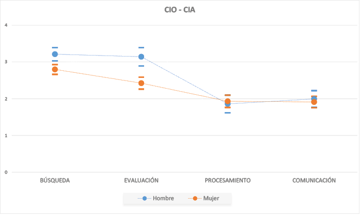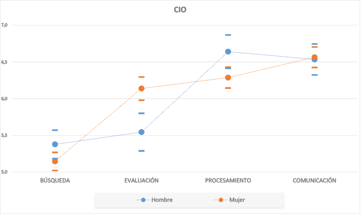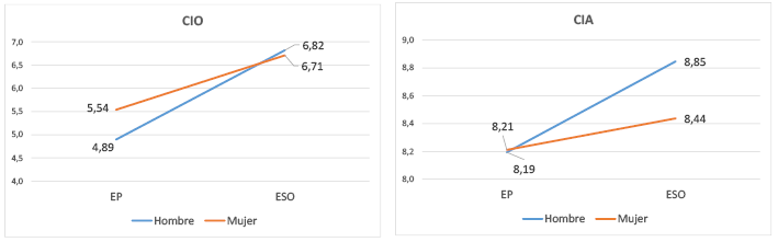 Se observa una interacción significativa entre la etapa educativa y el género en los modelos CIO y CIA, pero no en CIA-CIO (figura 5). Concretamente se observa que, mientras que en CIO son las mujeres en EP las que alcanzan niveles más elevados no habiendo diferencias claras en ESO, en CIA ambos grupos son similares en EP pero los hombres en ESO se auto-perciben con niveles superiores.