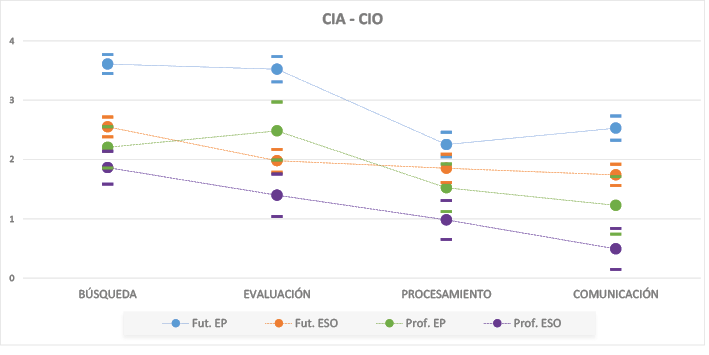 Analizando las puntuaciones en CIA y CIO obtenidas por los diferentes grupos, se han obtenido conclusiones de interés desde dos puntos de vista. Atendiendo a la estructura dimensional de la CI, la sobrevaloración de la auto-percepción frente al desempeño se produce en todas las componentes consideradas, y resulta especialmente intensa para la Búsqueda de Información. Esta componente tiene gran importancia porque constituye el primer paso para la gestión de la información así como una gran parte de la actividad en el aula y fuera de ella (De Aldama & Pozo, 2016; Cabanillas et al., 2020; Camacho & Esteve-Mon, 2018; Colás et al., 2018; Losada et al., 2017). Por otra parte, atendiendo a los grupos estudiados, destaca el menor grado de desempeño (CIO) mostrado por los dos grupos de futuros profesores, especialmente por los futuros profesores de EP, confirmando la segunda parte de la hipótesis H1. Esta diferencia se manifiesta claramente al analizar la discrepancia valorativa (CIA-CIO); los estudiantes de EP presentan unos valores de discrepancia valorativa muy superiores a los del resto, correspondientes a un desempeño muy pobre por parte de este grupo.