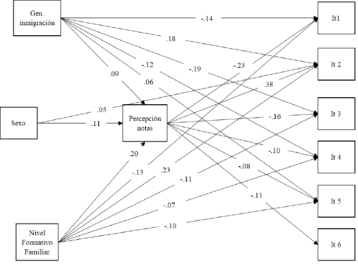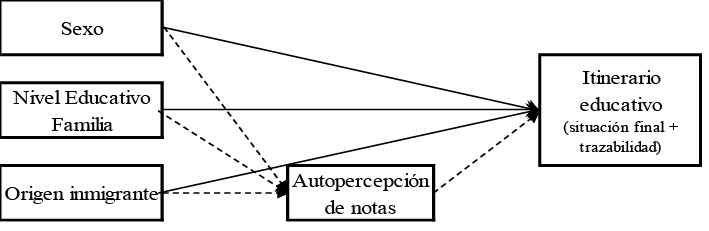 La combinación de las variables sociodemográficas y la autopercepción de las notas tendrá un impacto diferencial en los itinerarios educativos (efectos indirectos, mediados por la autopercepción de las notas). Los jóvenes provenientes de familias con niveles educativos elevados tenderán a una mayor presencia en itinerarios postobligatorios superiores lineales, aun cuando la autopercepción de notas sea baja, mientras que los que provienen de familias con niveles formativos medios -estudios postobligatorios- y bajos -obligatorios- tendrán menor presencia en los itinerarios académicos lineales, aun cuando la autopercepción de las notas sea elevada.
