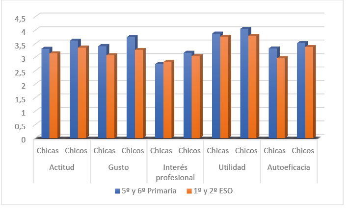 En cuanto a la segunda y tercera hipótesis al analizar qué ocurre a medida que los chicos y las chicas avanzan en edad, notamos que, en el caso de los chicos la correlación negativa entre la actitud hacia la ciencia en la Educación STEM, el gusto y la utilidad, es mayor que en el grupo de las chicas. Sin embargo, en la autoeficacia, ocurre lo contrario, las chicas obtienen correlaciones negativas más altas que los chicos. Al observar los valores medios, llama la atención el hecho de que la autoeficacia sea la dimensión que más diferencia a los chicos y las chicas a medida que progresan de curso, aunque solo podamos verlo a nivel descriptivo. Esto está en consonancia con algunos estudios que señalan que, para el mismo nivel de competencia, las chicas tienden a subestimar sus resultados respecto al valor que le dan los chicos a este mismo resultado (Bøe y Henriksen, 2013) o cómo la autoeficacia tiene una mayor influencia sobre el rendimiento en mujeres que en hombres (Fernández et al., 2019).