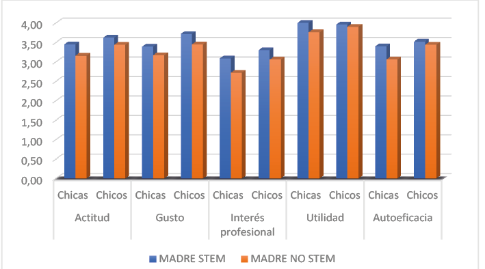 Siguiendo con los hallazgos de esta investigación si se estudian las diferencias en función de la profesión del padre y de la madre (profesión STEM o no STEM) se puede inferir que la profesión del padre no diferencia las medias ni en las actitudes ni en sus dimensiones. Sin embargo, en el caso de la profesión de la madre, se observan diferencias estadísticamente significativas en la actitud hacia la ciencia en la Educación STEM y en sus dimensiones, excepto en utilidad. Se percibe que las chicas muestran mayores diferencias que los chicos dependiendo de que la madre desempeñe una profesión STEM o no. Esto coincide con los estudios de la OECD (2015), que afirman que el desempeño de las niñas en ciencias pareciera estar más fuertemente asociado con antecedentes de madres con estudios superiores (profesión STEM) o investigaciones como la llevada a cabo por Melhuish et al. (2008) que explican que el nivel educacional de las madres es un factor relevante en el rendimiento matemático de los niños y las niñas, o Avendaño et al. (2020) que muestran que la influencia del padre tiene un efecto mínimo en el proceso de elección de carrera, mientras que el efecto de la madre es significativamente mayor.