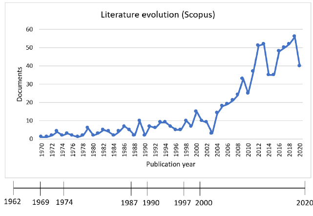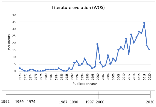 In the analysis of the evolution of literature on dyscalculia over time, two graphs were created to represent the distribution of the documents published from 1970 to 2020 in both the WoS and Scopus databases on a timeline of the most important events in history related to dyscalculia (Figure II and III). These two elements are presented together in order to detect any possible relationships between them. The most important events chosen for the timeline are the following: