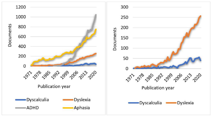 On the other hand, keeping in mind this study’s objective of analyzing the volume of scientific literature on dyscalculia, different searches were carried out using the terms: “dyslexia” (d*slexia), “TDAH” (ADHD), aphasia (a*asia). This served to compare the volume of literature on dyscalculia to that of other LDs or disorders. This search was done in the Scopus database using the same parameters as those used with the term dyscalculia. A total of 3941 results came up for documents on dyslexia, 11214 on ADHD, and 14479 on aphasia, compared to only 781 for dyscalculia. This data can be seen in the graph on the left (Figure IV) and is accompanied by a second graph on the right, which specifically compares dyslexia to dyscalculia. As one can observe, the first graph shows how the number of scientific publications on dyscalculia is very low as compared to those of other LDs or disorders, a trend that occurs even when comparing just dyslexia to dyscalculia, despite having a different growth factor and different starting points. In fact, in the case of dyscalculia, the ascending trend of publications commented on earlier is almost indiscernible when next to the corresponding evolution of other LDs or disorders.