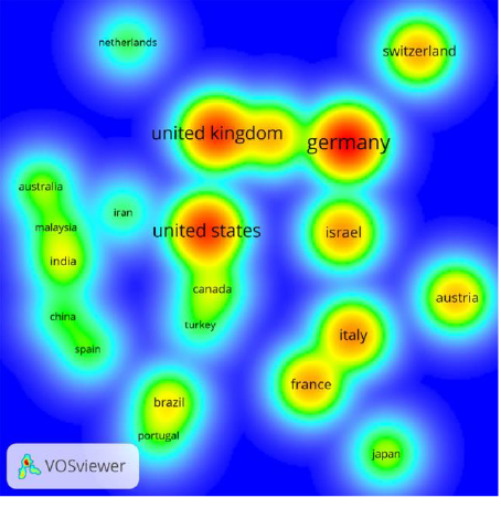 FIGURE V. Density map visualization of the bibliographic country coupling analysis in WoS