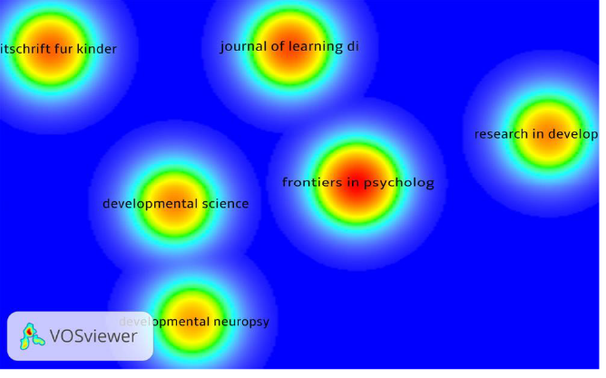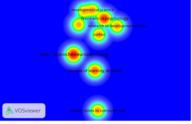 With the objective of getting to know the bibliographic sources that have the most publications on dyscalculia, an analysis of the source citations was also carried out. Figures VII and VIII show density visualization maps of the results of this analysis as a function of the relative weight of the documents. Sources with at least 10 publications were included. In WoS there were 6 sources retrieved out of 182 total, while in Scopus there were 9 out of 408.