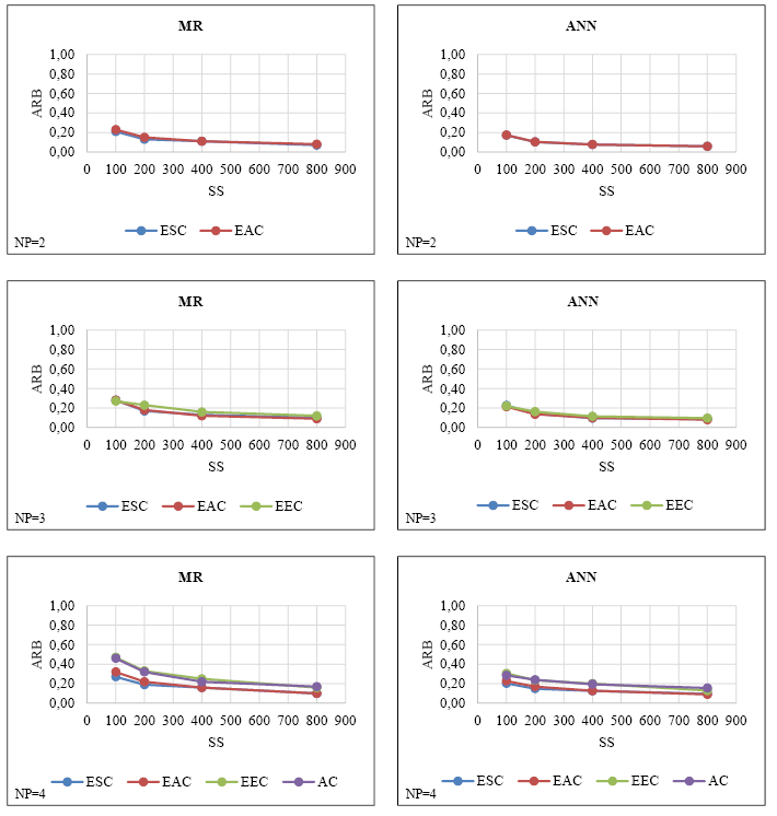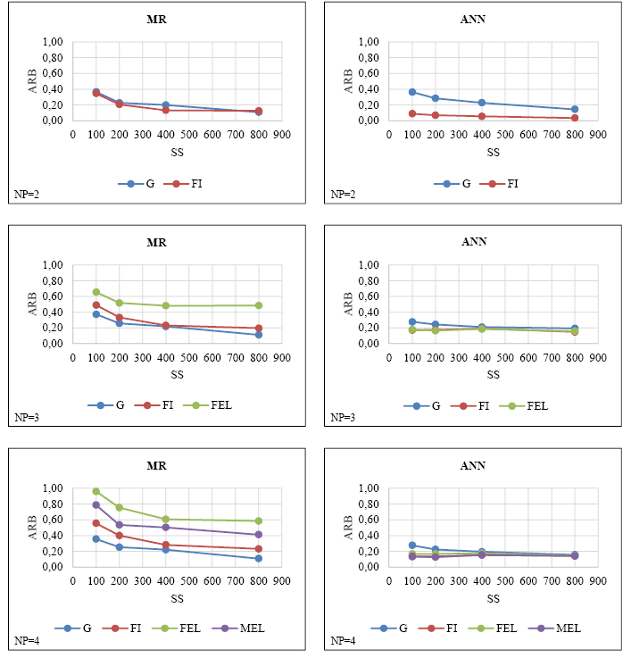 On the other hand, when the sample size is fixed, the increase in the number of predictors led to an increase in the MR ARB means; no such common pattern (i.e., increase, decrease) was observed for ANN ARB means. In addition, it is noteworthy that the deterioration in ARB means is more dramatic, specifically in small sample sizes.