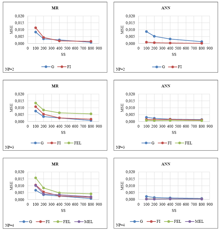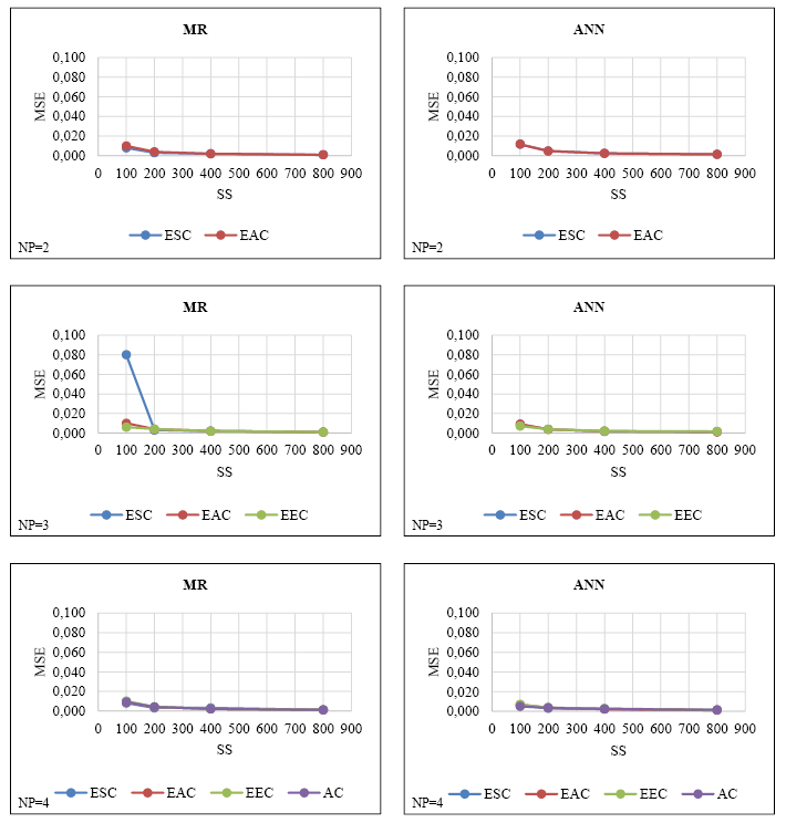 As a result, when ARB and MSEs are considered, ANN outperforms MR. For this reason, it can be suggested that researchers prefer ANN firstly. MR is a reasonable alternative to ANN if the predictors are continuous and their assumptions are met. However, it should be noted that MR may not perform well even if its assumptions are met if the predictors are discrete. Specifically, in the case of three or more discrete predictors, it may be recommended for researchers to use ANN. In addition to this, it should be emphasized that an important advantage of ANN is that it does not need the assumptions required by MR.