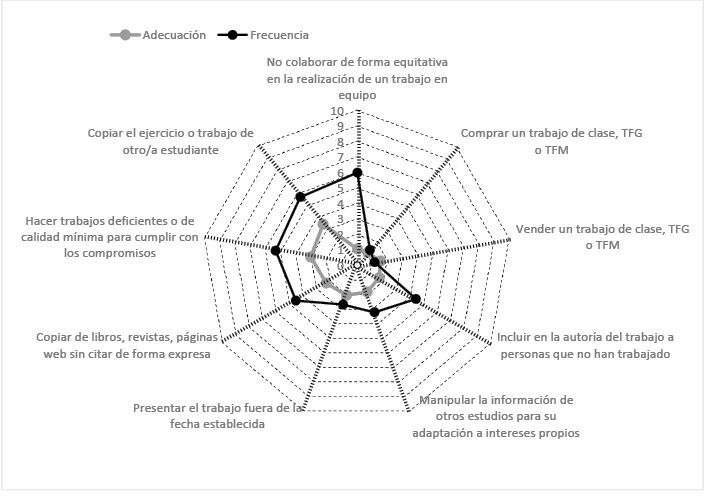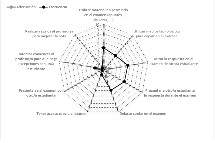 Con el objetivo de identificar los comportamientos que son considerados como deshonestos por los estudiantes se procede a realizar un análisis descriptivo basado en el cálculo de las valoraciones medias obtenidas para cada uno de los ítems de cada uno de los bloques de comportamientos anteriormente presentados, y desde cada una de las dos perspectivas de análisis: nivel de adecuación del comportamiento y frecuencia observada de ocurrencia del mismo. Para facilitar la comparación entre ambas perspectivas, los resultados se presentan en gráficos de tela de araña realizados con el programa informático Excel.