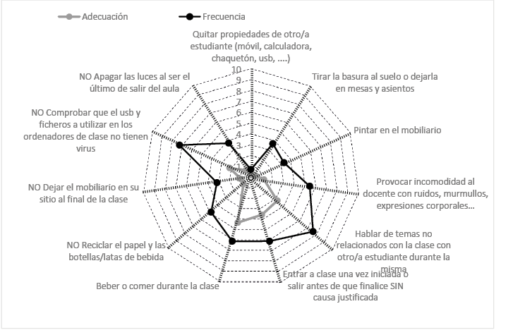 Las conductas relacionadas con las normas de convivencia en las aulas son las quebrantadas con una mayor frecuencia, principalmente aquellas dirigidas a molestar tanto a profesores como estudiantes durante el desarrollo de la clase (hablar en clase, generar ruidos, interrumpir las clases entrando y saliendo durante las mismas, ). Por otra parte, sorprende que ciertos comportamientos en pro de la sostenibilidad del medio ambiente no sean observados con la frecuencia deseada, especialmente los relacionados con el reciclaje o el ahorro energético, cuando en la actualidad hay una apuesta clara por una mayor sostenibilidad (Horizonte 2030 -Objetivo de Desarrollo Sostenible -ODS-).