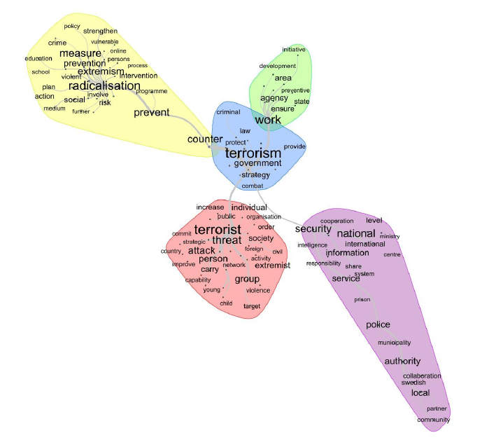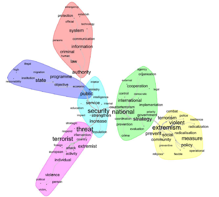 The network of similarities between countries without fatalities is characterised by the core objective of security, both of territories and their citizens. “Security” is the most relevant word on account of its centrality and its size. On the other hand, they are aware of the threat and seek to keep extremism under control. This is also the location of programmes and public services which help to shape social policies and foster cooperation. However, references to education are practically non-existent and vague, and occupy residual positions.