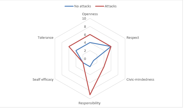 The analysis in respect of attitudes is justified because they are critical in adolescence and during school years (period in which principles and future moral standards are formed). Secondly, because education strategies that promote attitude change are the means by which to improve the capacity for dialogue, reflection and participation (García-López and Sales, 1998), they contribute to the construction of a European citizenship (Viejo, Gómez-López and Ortega-Ruiz, 2019) and, conversely, attitude changes may be a precursor to ideological changes which pave the way for violent radicalisation (de la Corte and Muro, 2020). Finally, because they do not tend to be included in intervention programmes (Burde et al., 2015). The particular multivariable elements connected with attitudes are therefore analysed: openness, respect, civic-mindedness, self-efficacy and tolerance, as conceptualised by the Council of Europe (Council of Europe, 2016a) and adopted by the OECD (OECD, 2018a).