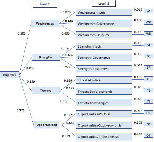 FIGURE V. Overall scores of factors, sub-factors and SWOT indicators. Internal factors, sub-factors and indicators