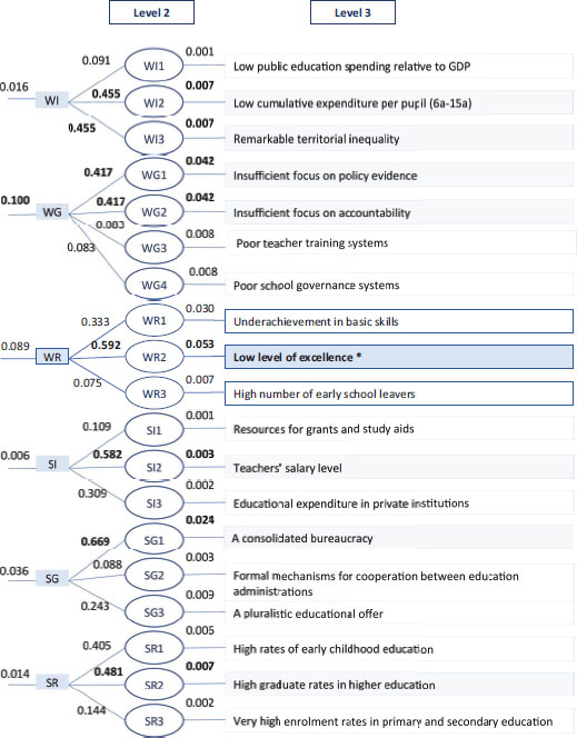 In the present study, the application to the Spanish education system of the procedural scheme represented in figure II has been carried out at two levels of concreteness in addition to that of the factors: that of the sub-factors and that of the indicators. As far as internal factors are concerned, their expression at the level of sub-factors has been based on the systemic approach, as is characteristic of the world of international education indicators (CERI-OECD, 1992), albeit centred on the three categories: resources, processes/policies (governance) and results. Regarding the external factors, we have based ourselves on the PESTEL model (Shilei &Yong, 2009; Yüksel, 2012; Jadan, 2020), but limiting this to the political, socio-economic, and technological categories. The general criterion for selecting the sub-factors in terms of indicators was relevance, which is supported by the results of a considerable amount of research and statistics, both national and international.