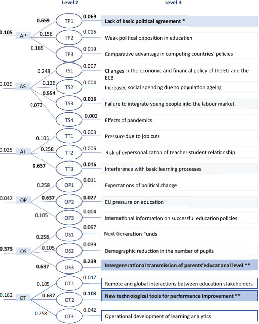 The following three figures (IV, V and VI) show the results of the multilevel quantitative analysis. Thus, figure IV shows the SWOT factors and their sub-factors (levels 1 and 2), together with the figures representing the partial and global – or composite– priorities resulting from taking into consideration the different levels analysed. The highest relative values for each stage of analysis are highlighted in bold.