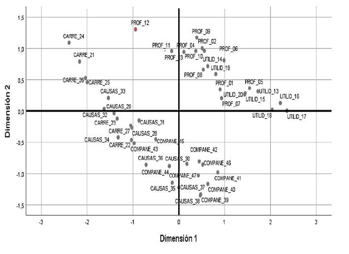 A continuación, en el Gráfico I, originada como consecuencia de ejecutar el procedimiento PROXSCAL, se muestra el mapa bidimensional de las respuestas dadas a los ítems de CUDECO, que toma los valores de las dos dimensiones como coordenadas. Se han marcado los ejes de coordenadas para visibilizar los cuadrantes a la hora de interpretar los resultados. De este modo, al poder visualizar la información y las interacciones entre variables, se abren posibilidades para que el observador, a través de su capacidad cognitivo-perceptiva, e incluso intuitiva, realice una exploración y comprensión de numerosas unidades de información al mismo tiempo.