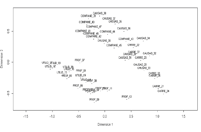 – Hacia un lado se van situando aquellos ítems pertenecientes a los factores utilidad y profesorado; mientras que causas y compañeros/as se hallan colocados hacia el otro lado. En el vértice se agrupan fundamentalmente aquellos relacionados con el factor carrera y, en menor medida, con causas y profesorado.