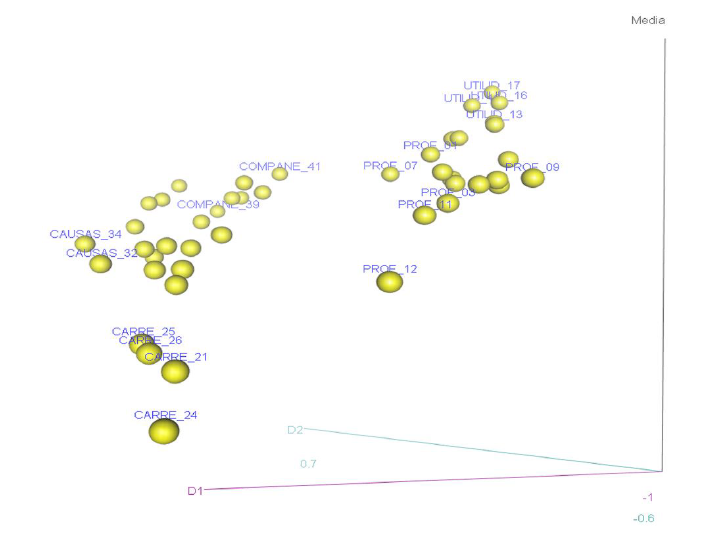 Si se añade como una nueva coordenada el valor de la media a los resultados de SMACOF, se obtiene una representación tridimensional de los mismos (véase Gráfico III).