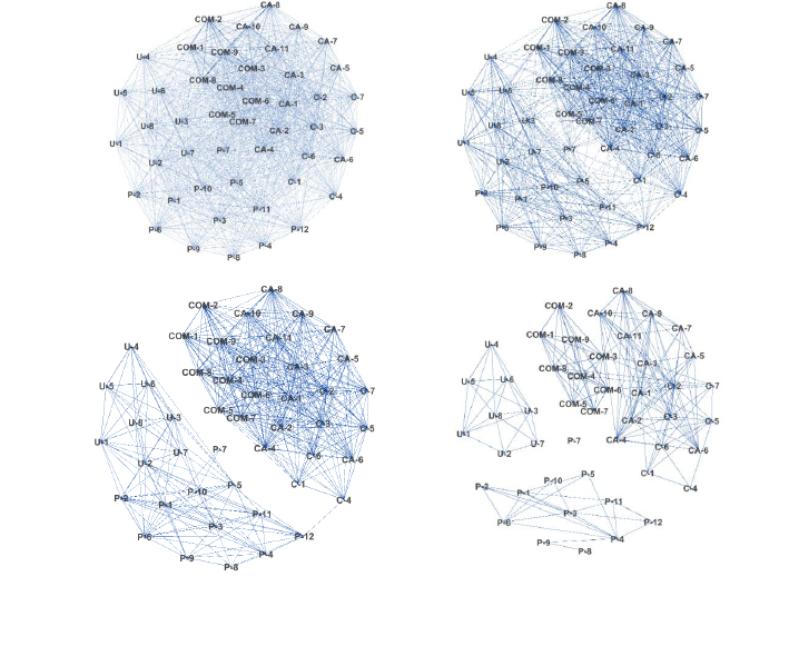 En el Gráfico IV se puede comprobar como la intensidad de las relaciones definen grupos, los mismos observados en los resultados del EMD. La primera gráfica muestra todas las relaciones, la segunda sólo aquellas con correlaciones r >/.15/, la tercera r >/.2/ y la última r >/.3/