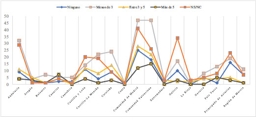 En cuanto a la cantidad de proyectos y actividades implementadas en el centro su distribución es la siguiente: el 14.9% (n = 123) indica que no se desarrolla ninguno, el 33.8% (n = 279), entre uno y dos, el 15.4% (n = 127) de tres a cinco, el 7.7% (n = 64) más de seis, y el 28.2% (n = 233) no sabe o no contesta. En este sentido, según lo reportado por los participantes, los centros que desarrollan más proyectos y actividades son aquellos que se encuentran en Andalucía, Castilla y León, Castilla-La Mancha, Cataluña, Comunidad de Madrid, Comunidad Valenciana, País Vasco y Principado de Asturias (GRÁFICO II).