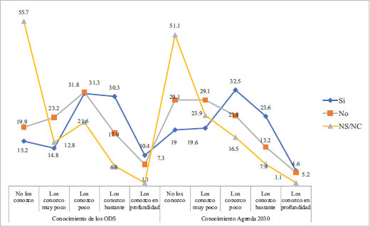 En respuesta a la H1, podemos afirmar que el grado de conocimiento de la Agenda 2030 (p = .000) y de los ODS (p = .000) por parte del profesorado correlaciona significativamente (p = < .05) con el desarrollo de proyectos y actividades de sensibilización y concienciación por parte del centro educativo. El profesorado que ejerce su docencia en los centros que desarrollan proyectos y actividades de sensibilización y concienciación, tiene mayor grado de conocimiento sobre la Agenda 2030 (17.4%; n = 144) y los ODS (24.5%; n = 203) en comparación con aquellos que desconocen si en su centro se desarrollan proyectos con este enfoque (22.7%; n = 188). Esto demuestra que desarrollar proyectos vinculados a los ODS en el centro educativo en el que se imparte docencia, conduce a una mayor concienciación para transitar hacia la educación para el desarrollo sostenible en las aulas en consonancia con la H2 (GRÁFICO I).