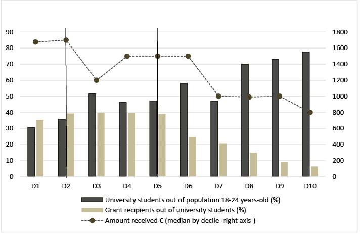 FIGURE I. Proportion of young university students, grant recipients and median amount received by income deciles