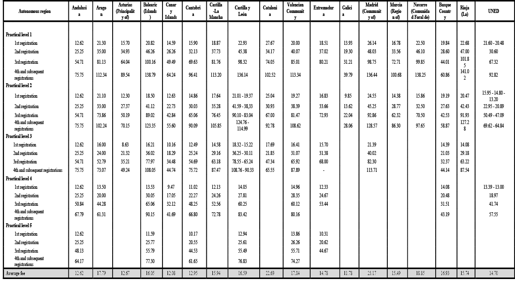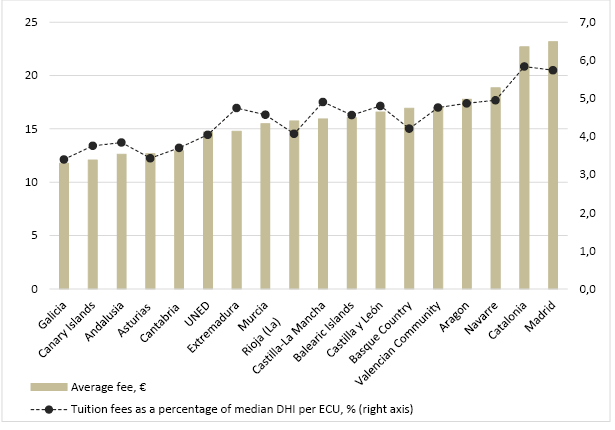 Tuition fees are considered as public prices according to Law 8/1989, of 13 April, on Fees and Public Prices (Tasas y Precios Públicos). This means that they must, at least, cover the cost of carrying out the activity. However, the Law also states that lower prices can be set when there are reasons that make it advisable to do so. In accordance with Organic Law 6/2001, of 21 December, on universities, modified by Royal Decree-Law 14/2012, of 20 April, these prices are set by each autonomous region, which, according to its criteria, also establishes the number of the different practical levels (experimentalidad), then assigns a practical level for each degree and, finally, determines the price increase between each practical level and between the first and successive registrations. The price per credit does not depend on the economic situation of the student but on the region where he/she lives, the practical level of degree and the number of times he/she has enrolled for the same subject. In order to facilitate the comparison between regions, the analysis of equity from a geographical point of view has been conducted using the average price per credit for first-time enrolment in Bachelor’s degrees calculated by the Ministry of Universities (see annex). The analysis has been completed with a comparison regarding tuition fees burden for families, calculating the proportion that this cost represents, based on the average price, out of the median DHI per ECU in each region.