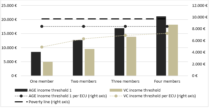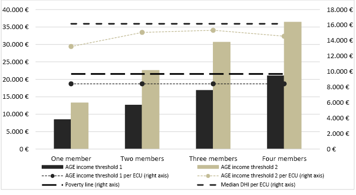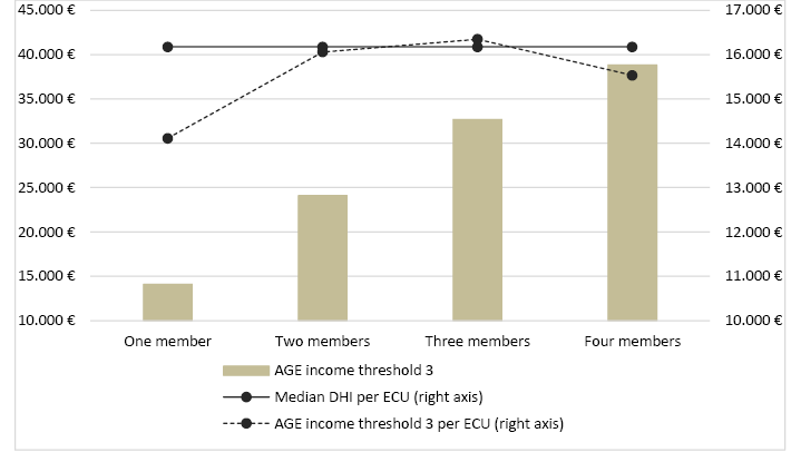 It can be observed that the AGE threshold per ECU is not stable and that, for one- and four-member households, it is below the median income, at 14 and four per cent, respectively.