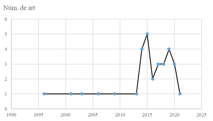 Respecto a la fecha de publicación de estos estudios, desde 1996 hasta 2014 se identifica un artículo por año que responde a la pregunta de investigación planteada y que cumple con todos los criterios de inclusión. A partir de esta fecha, la tendencia incrementa, tal y como se puede observar en el Gráfico I. Teniendo en cuenta que la búsqueda de los estudios se llevó a cabo en marzo de 2021, no se puede concluir que en 2021 esa tendencia no continúe o disminuya.