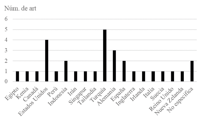 Asimismo, se han identificado intervenciones realizadas en 18 países (Gráfico II). Turquía es el país en el que más intervenciones se han realizado (5 de 31), seguido de EEUU (4 de 31), Alemania (3 de 31), Indonesia (2 de 31) y España (2 de 31).
