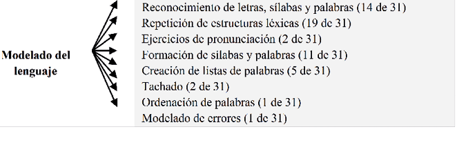 En cuarto lugar, las actividades de enseñanza-aprendizaje con mayor recurrencia son aquellas que plantean la instrucción de la lectura sobre bases de modelado del lenguaje. Nuevamente, nos situamos frente al paradigma tradicional de enseñanza de la lengua donde resaltan dos mecanismos de actividad fundamentales: el aprendizaje por repetición y la técnica de prueba y error. Parece evidente que las estrategias didácticas más tradicionales de los modelos de enseñanza gramatical y métodos directos siguen teniendo una fuerte influencia, también, en las intervenciones actuales.