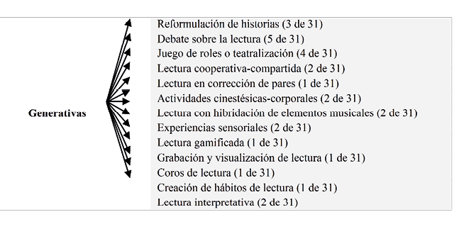 A pesar de que no se evidencian actividades que potencien competencias instrumentales o epistémicas, comienzan a aparecer, especialmente en los estudios más recientes analizados, estructuras de actividad de carácter generativo. Por ejemplo, y sobre los influjos de las metodologías de gamificación o las propias tertulias dialógicas, hacen aparición nuevos formatos de actividad como los debates de lectura, la reconstrucción de historias o la lectura gamificada. Conviene subrayar que, a pesar de este último apunte, el marco pedagógico de estas actividades sigue sustentándose sobre un marco funcional donde se privilegia únicamente el hecho comunicativo interpersonal sin posibilitar el acceso a otros conocimientos, o relacionar el lenguaje y el pensamiento (niveles de tipo instrumental y funcional).
