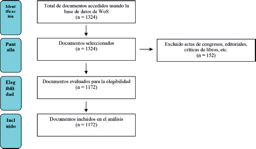 Los datos analizados en este estudio fueron extraídos de bases de datos en Social Science Citation Index (SSCI), Science Citation Index Expanded (SCI-Expanded) y Arts & Humanities Citation Index (A&HCI) en la WoS Core Collection, que es una fuente habitual para la investigación bibliométrica. WoS incluye los estudios científicos más fiables y de mayor impacto (Zyoud et al., 2017), y plataforma de información analítica y de búsqueda de citas científicas líder apoyando diversas tareas científicas en múltiples dominios de conocimiento, así como un conjunto de datos para estudios intensivos en datos a gran escala (Li et al., 2018). Además, alrededor del 99.11% de las revistas indexadas en la base de datos WoS también están indexadas en la base de datos Scopus (Singh et al., 2021). Este estudio también utilizado los Artículos de Informe Preferidos para Revisiones Sistemáticas y Meta-Análisis (PRISMA) (Figura I) que proporciona un esquema transparente y estandarizado para visualizar la identificación y selección de los resultados del estudio en el proceso de revisión bibliométrica y meta-análisis (Moher et al., 2009). La literatura relacionada fue identificado en la base de datos de WoS utilizando “liderazgo educativo” para buscar en términos de “Tema”. Las categorías escogidas fueron Educación e Investigación Educativa, con un lapso de tiempo de 1974 a 2020, y fueron examinados un total de 1324 estudios. Después de excluir actas de congresos, materiales editoriales, reseñas y capítulos de libros, la búsqueda realizada en el abril de 2021 con un total de 1172 documentos (Figura I).