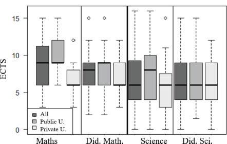 Analysing each discipline, the findings are similar in Mathematics and Science in terms of the most relevant aspects. Firstly, there is a wide dispersion in the ECTS credits allocated to these disciplines, which agrees with other studies on public universities (Castro-Rodríguez and Montoro, 2021; García-Barros, 2016; Naya-Riveiro et al., 2021) and private universities (Nolla et al., 2021). Furthermore, it has been found that the difference between types of universities is essentially due to the lesser amount of time dedicated to disciplinary content in private universities, and not so much to the time spent in didactic content. In general, these values are below the recommendations of the White Paper on Primary Education Teacher Degrees (ANECA, 2005, p.201), which suggests a minimum of 20 ECTS for Mathematics (Naya-Riveiro et al., 2021) and a higher teaching load than those obtained for Science. In fact, this poor training is associated with the lack of confidence and insecurity that primary school teachers experience when teaching these disciplines (García-Ruiz and Sánchez, 2006; Jarvis and Pell, 2004).