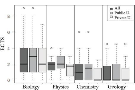 GRAPH III. ECTS credits allocated to Biology, Physics, Chemistry, and Geology in public and private universities