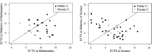 GRAPH I. Distribution of ECTS credits allocated to Mathematics (top) and Science (bottom), including their disciplinary and didactic contents, in public and private universities