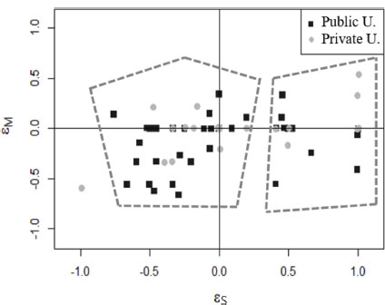 GRAPH V. Parameter ε for Mathematics and Science of the universities analysed. The groups identified in the cluster analysis are indicated