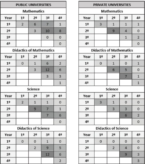 To answer the first two research questions, the contents and timing of the subjects in the sample were identified based on the teaching guides. According to the most frequent division, the contents were classified into: Mathematics, Physics, Chemistry, Biology, Geology, Didactics of Mathematics, and Didactics of Science.