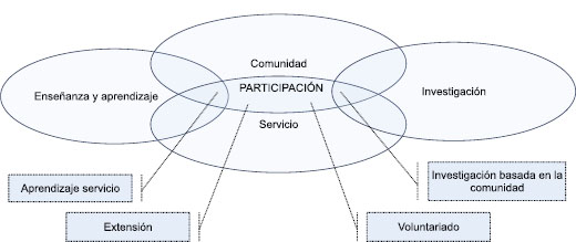 Por otra parte, la propuesta teórica de Bender (2008) reconoce tres roles generales de las instituciones de educación superior (enseñanza y aprendizaje, investigación, y servicio comunitario) que se conectan a través de interfaces de interacción e incorporan a la comunidad como factor preponderante, conformando un modelo que define estrategias generales de CE, coherentes con las funciones de las IES (Figura II).