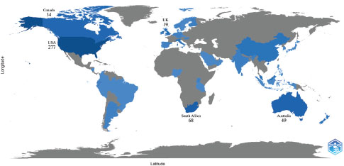 La Figura V muestra que los países con mayor producción científica fueron, en orden decreciente, Estados Unidos de América (277 artículos), Sudáfrica (68), Australia (49), Canadá (34) y el Reino Unido (19). Estos resultados ratifican el liderazgo indiscutido de Estados Unidos, el cual se explicaría, en parte, por su extensión territorial, que acoge a importantes instituciones, centros y grupos de investigación reconocidos mundialmente, así como por el idioma en el que publican (inglés).