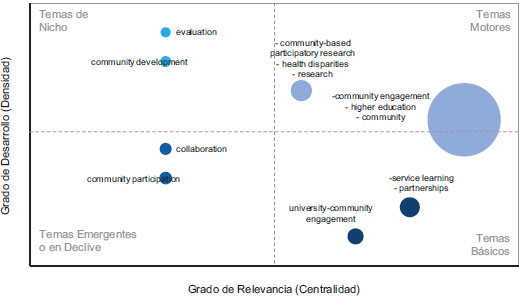 Las universidades modernas tienen la tarea de transferir habilidades, conocimientos y valores que permitan al estudiantado lograr un mayor compromiso con los desafíos de la sociedad y el medio ambiente. Esta investigación tiene como objetivo analizar el panorama investigativo del vínculo universidad-comunidad (community engagement). Metodología: Se aplicó un examen bibliométrico descriptivo longitudinal de la literatura científica publicada durante el periodo 2005-2021. Los datos fueron obtenidos mediante la búsqueda en las bases de datos Scopus y Web of Science, empleando la declaración PRISMA para revisiones sistemáticas. Se calcularon indicadores bibliométricos para describir la producción, dispersión, distribución y crecimiento de los artículos. A través del mapeo bibliométrico, se exploraron las redes de coocurrencia de los términos claves más utilizados. También se realizó un examen temático mediante el esquema de categorización de Callon et al. (1991). Para analizar los datos se utilizó el paquete Bibliometrix R y la aplicación Biblioshiny y, para la visualización de las salidas del análisis de red se usó el programa VOSviewer. Resultados: Hubo 404 artículos, que fueron publicados en 262 revistas, provenientes mayormente de Estados Unidos (277), con un promedio de 8 citas por documento. El crecimiento anual de la literatura fue de 29%, con una tendencia de ajuste exponencial (R2= .93). La mayoría de los autores publicó solo un artículo (93%) en las áreas de educación y salud. Se hallaron 8 clústeres temáticos distribuidos en tópicos motores, básicos, de nicho y emergentes. Conclusiones: El estudio confirma una producción científica creciente sobre community engagement, que se concentra en pocas revistas y numerosos autores. Se denotan diversos tópicos (como el compromiso y desarrollo comunitario, el aprendizaje-servicio y la investigación participativa basada en la comunidad) que tienen implicaciones relevantes para universidades, instituciones de educación superior y responsables de políticas públicas.