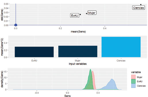 GRÁFICO I. Resultados de la red neuronal, incluyendo las métricas propuestas por Pizarroso et al. (2022), para los estudiantes de la Universidad Complutense de Madrid (media en las asignaturas de matemáticas empresariales I y II)
