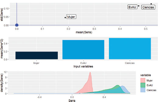 En el apartado de resultados se han incluido los tres indicadores propuestos por Pizarroso et al. (2022) para interpretar los resultados de una red neuronal: mean sensitivity, sensitivity standard deviation y mean squared sensitivity. Como ya se ha indicado, en una red neuronal para cada dato se obtiene una pendiente o sensitivity, que es equivalente a una beta en un modelo de regresión, de modo que una determinada variable tiene tantas betas como datos haya en la muestra. Es decir, en lugar de obtener un valor para la pendiente de cada variable, obtenemos una función de densidad, que en ausencia de relaciones no lineales tendrá una media (mean sensitivity) igual a la pendiente del modelo de regresión. La presencia de distribuciones con varias modas o elevada dispersión (altos valores de sensitivity standard deviation) son indicadores claros de la presencia de efectos no lineales o interacciones. En el caso de detectarse, obligarían a modificar la especificación funcional del modelo de regresión5. Por último, el valor de la mean squared sensitivity es la métrica que los autores proponen para determinar la importancia relativa de cada uno de los predictores.