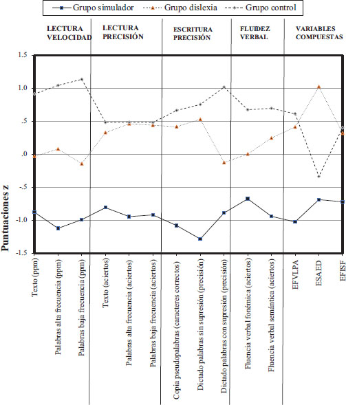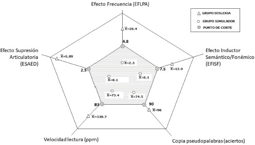 FIGURA VII. Representación multidimensional de los valores promedio en los cinco indicadores de los grupos simulador y dislexia