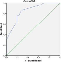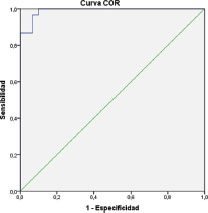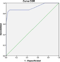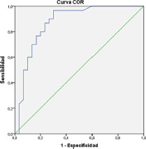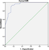 El análisis de curva COR ofrece un valor de área bajo curva de 0,94 (muy bueno). Este indicador podría considerarse clínicamente importante en la detección de la simulación. El punto de corte de 90 caracteres copiados correctamente muestra sensibilidad 90% y especificidad 86,7% (ver figura IV).