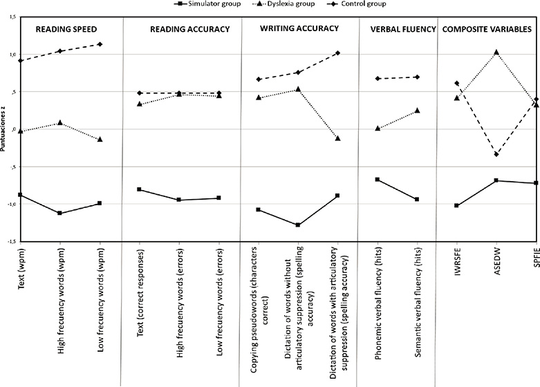 The simulator group obtained the worst results in all tasks, showing a general tendency to exaggeration. The differences between the three groups were always significant and with high effect sizes, higher for speed and lower for accuracy. Table I shows the scores obtained by the three groups in all the tests administered and in the composite variables, as well as the corresponding statistical comparisons using the one-way ANOVA.