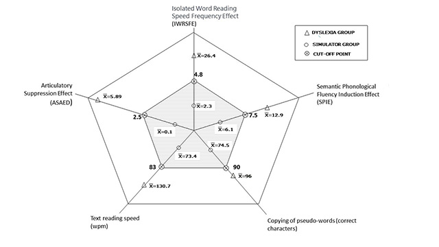 FIGURE VII. Multidimensional representation of the average values for the five indicators in the simulator and dyslexia groups