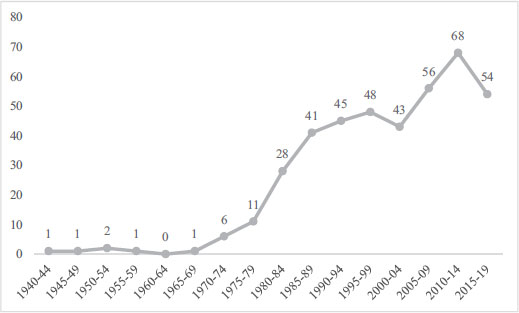 As shown in Figure III, the emergence of Spanish scientific journals in education began in 1980. Scientific production in education moved from being centripetal and regional to expanding beyond Spanish borders and cooperating with other sciences, which is positive. The number of works published in English is also increasing, with the number of authors per article and the number of international collaborations also increasing, from 40.99% in 2011 to 52.68% in 2020. The percentage of papers having only one author decreased from 26.40% in 2011 to 16.31% in 2020, while the percentage of national collaboration remained at 32% (IUNE Observatory, 2022).