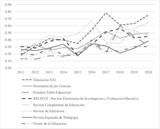 Moreover, it is noteworthy that four of the eight journals were indexed in 2011 in JCR’s SSCI and continue to be indexed today (Educación XX1, Enseñanza de las Ciencias, Revista de Educación and Revista Española de Pedagogía), with an impact index that has also shown a positive evolution.